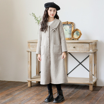 Ropa de mujer Otoño e Invierno chica francesa abrigo de lana suelto estilo japonés tamaño pequeño Plaid muñeca cuello arco abrigo