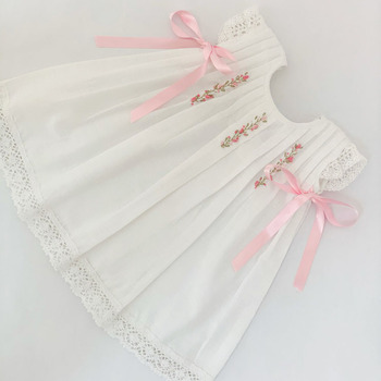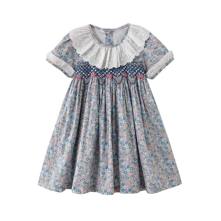 Mùa hè handmade thêu hoa bé gái ăn mặc Ruffle cổ áo ngắn tay áo Đầm chất lượng cao cotton dệt smocked Đầm